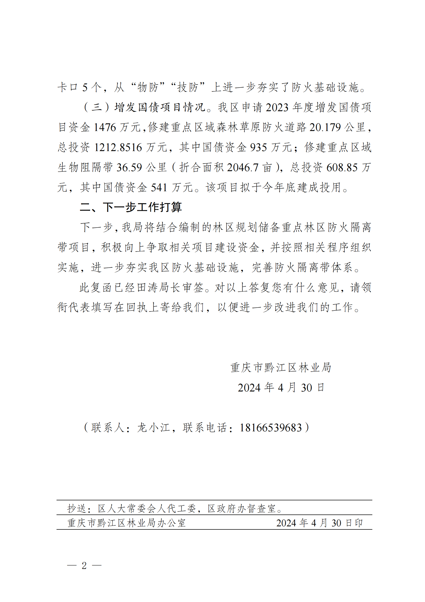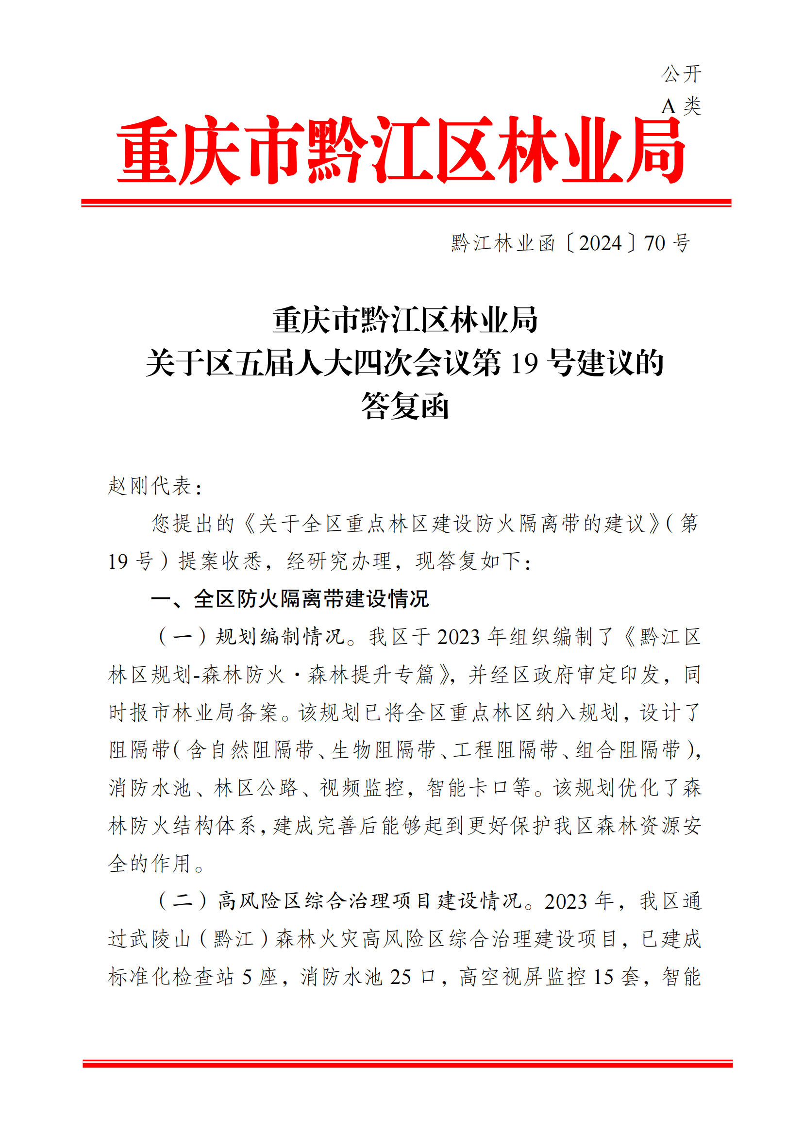 重慶市黔江區林業局關于區五屆人大四次會議第19號建議的答復函