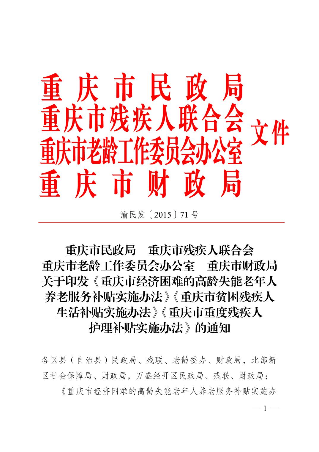 關于印發《重慶市經濟困難的高齡失能老年人養老服務補貼實施辦法》《重慶市貧困殘疾人生活補貼實施辦法》《重慶市重度殘疾人護理補貼實施辦法》的通知(渝民發〔2015〕71號)