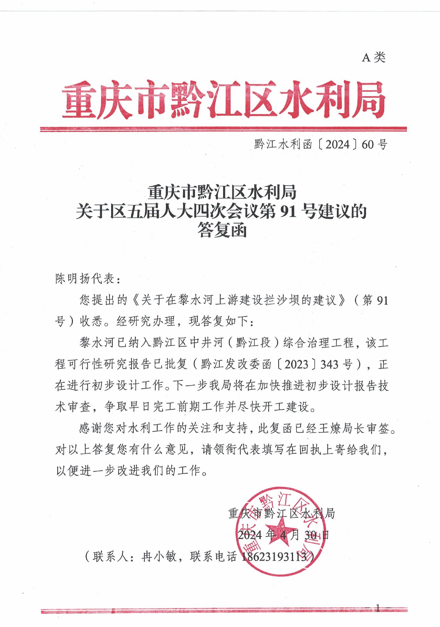 重慶市黔江區(qū)水利局關(guān)于區(qū)五屆人大四次會(huì)議第91號(hào)建議的答復(fù)函