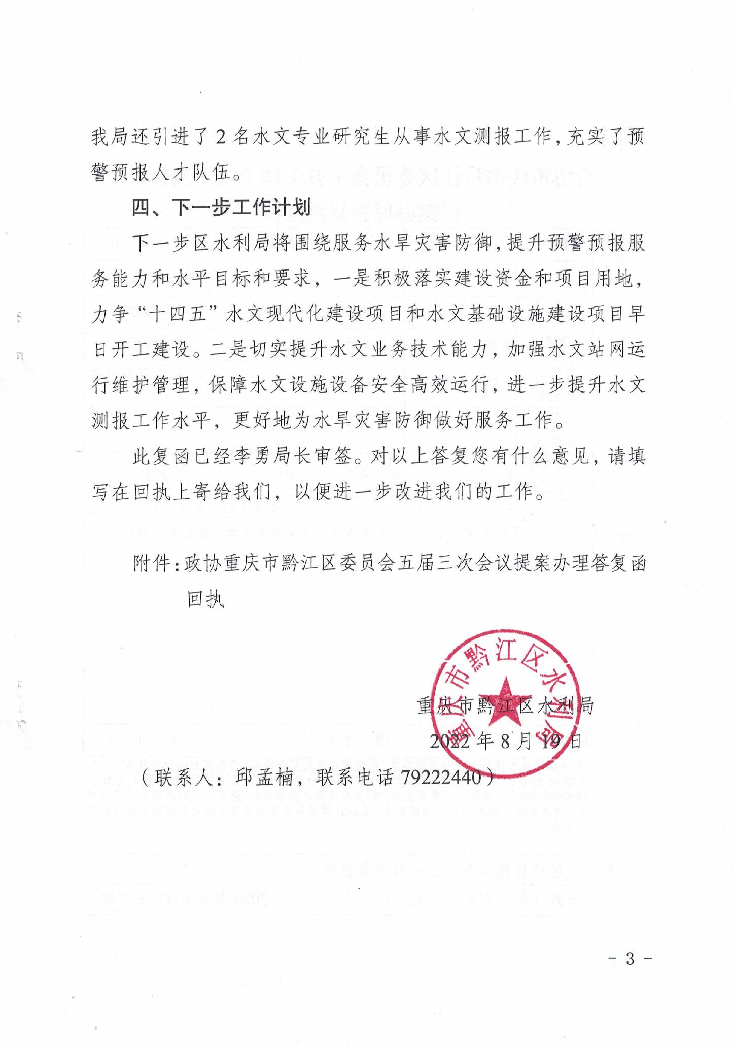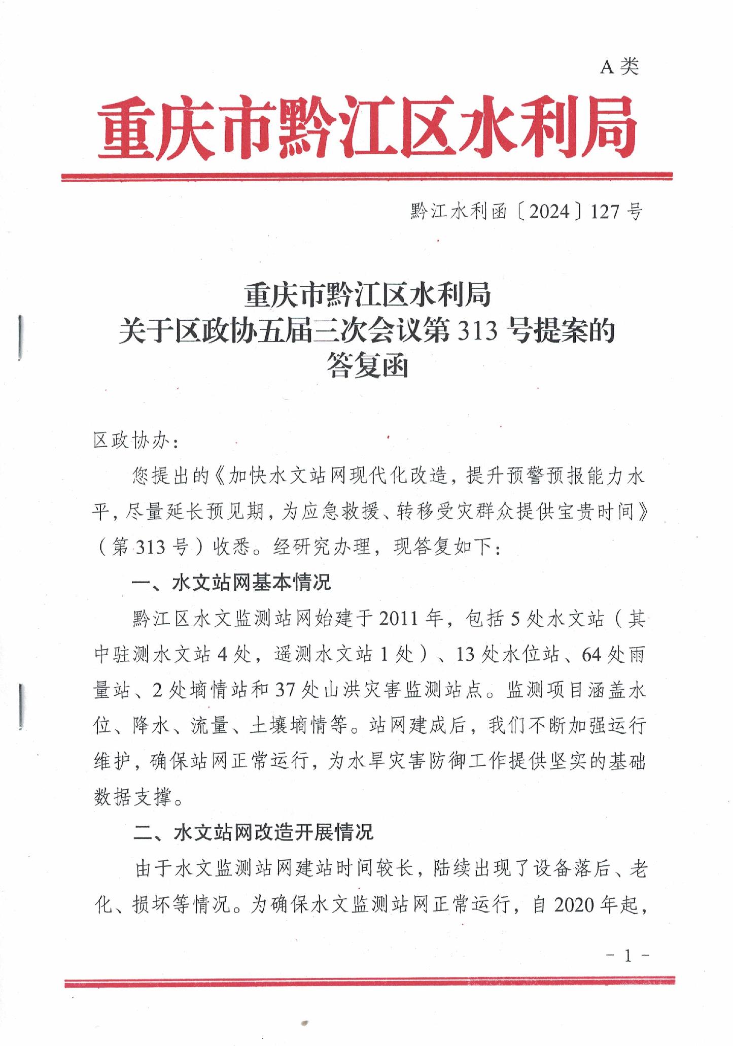 重慶市黔江區(qū)水利局關(guān)于政協(xié)五屆三次會議第313號提案的答復(fù)函