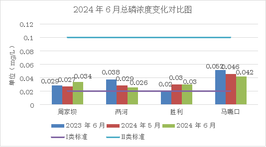 2024年6月,周家壩、勝利、兩河、馬嘶口斷面水質均為Ⅱ類,定類因子均為總磷。兩河、馬嘶口斷面總磷濃度同比與環比總體呈下降趨勢,周家壩斷面則同比與環比均呈上升趨勢,勝利斷面環比持平,同比上升。其中:周家壩斷面總磷濃度同比升高14.7%,環比升高20.6%;兩河斷面總磷濃度同比下降46.1%,環比下降11.5%;勝利斷面總磷濃度同比升高33.3%,環比持平;馬嘶口斷面總磷濃度同比下降23.8%,環比下降9.5%。2024年6月周家壩等四個斷面總磷濃度同比環比變化對比情況詳見圖1。