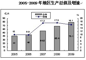 初步核算,2009年全區實現地區生產總值79.10億元,比上年增長16.1%,其中第一產業實現增加值9.26億元,增長5.4%;第二產業增加值38.53億元,增長18.7%;第三產業增加值31.31億元,增長15.8%。三次產業比例由上年的12.8∶ 47.7∶39.5調整為11.7∶48.7 ∶39.6,三次產業對經濟增長的貢獻率分別為3.6%、56.8%和39.6%。按常住人口計算的人均GDP為18090元。
