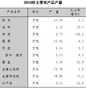 全年肉類總產(chǎn)量達到6.14萬噸,比上年增長9.5%,其中豬肉5.53萬噸,增長9.4%;牛羊肉0.49萬噸,增產(chǎn)12%。年末生豬存欄58.89萬頭,減少2.2%;牛存欄9.53萬頭,增長6.6%;羊存欄2.03萬只,增長8.3%。全年生豬出欄75.38萬頭,增長1.8%。全年水產(chǎn)品產(chǎn)量0.13萬噸,增長12.8%。