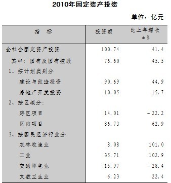 全區(qū)全社會固定資產(chǎn)投資完成100.74億元,比上年增長41.4%,投資對經(jīng)濟增長的貢獻率為60%,拉動經(jīng)濟增長11.9個百分點,其中基礎(chǔ)設(shè)施建設(shè)投資35.21億元,占全社會固定資產(chǎn)投資的35%。全年完成建設(shè)與改造投資90.69億元,增長44.9%,占投資總量的90%;完成房地產(chǎn)開發(fā)投資10.05億元,增長15.7%。