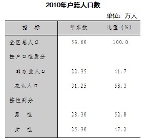 年末全區(qū)戶籍總?cè)丝?3.6萬人,比上年增加0.92萬人。全區(qū)非農(nóng)業(yè)人口22.35萬人,農(nóng)業(yè)人口31.25萬人;人口自然增長率為6.1‰。