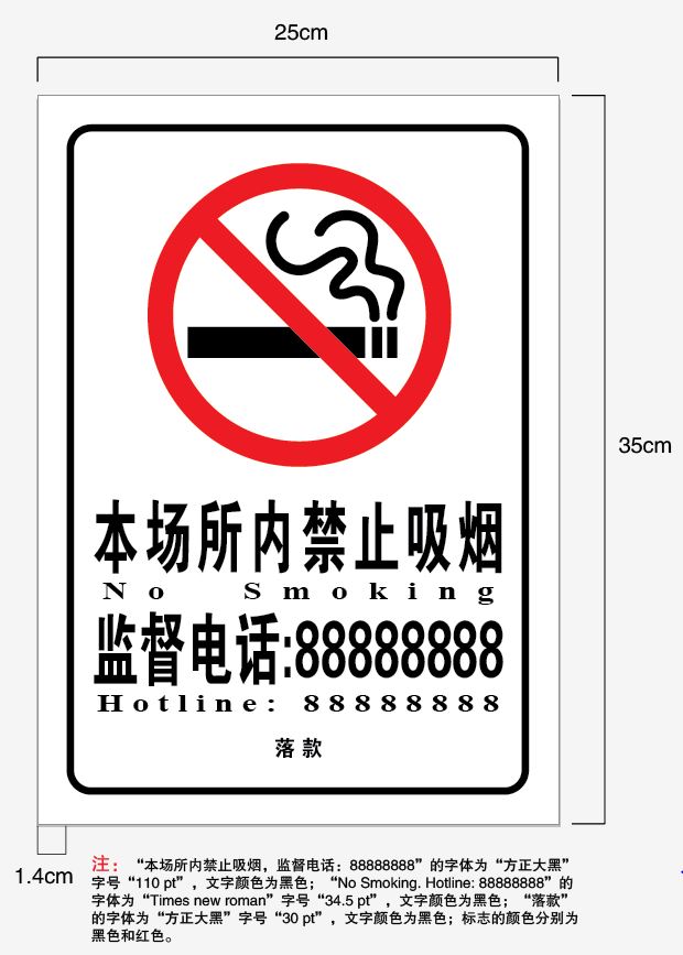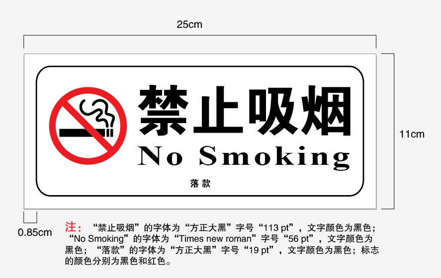 所有室內區域應廣泛張貼或擺放醒目的禁煙標識(基礎設計模板如下圖所示),至少包括入口處、訪客登記處、大廳、會議室、走廊、衛生間、茶水間、食堂、樓梯、電梯等區域,可根據需要擴大至室外區域。標識要醒目、位置要明顯。