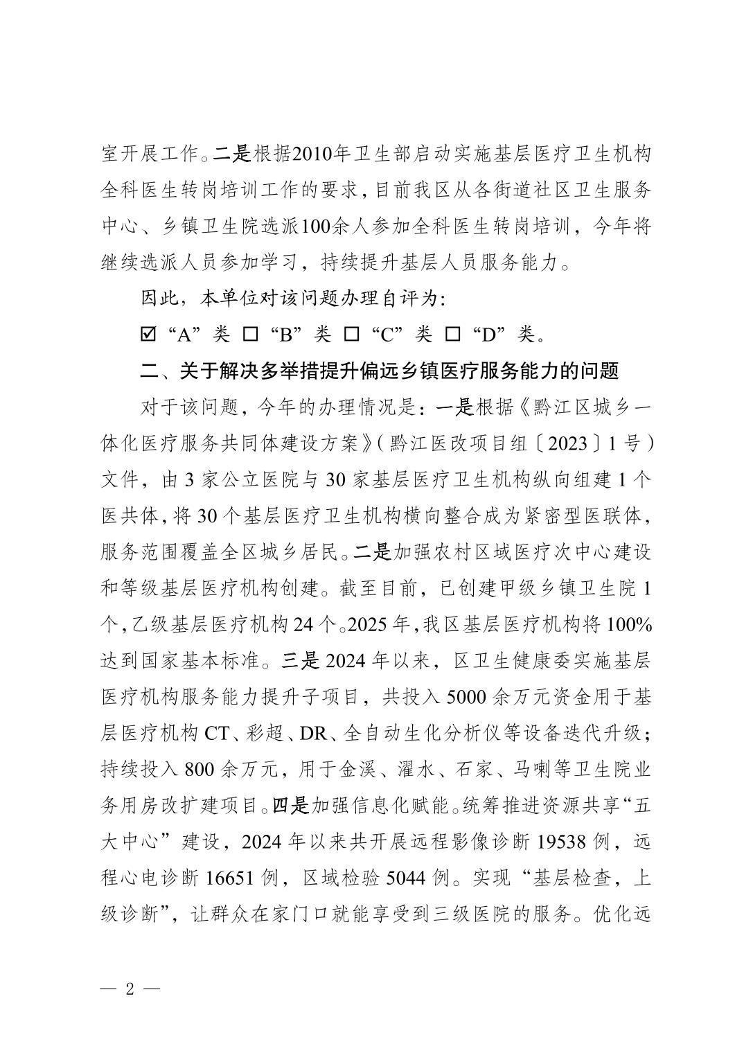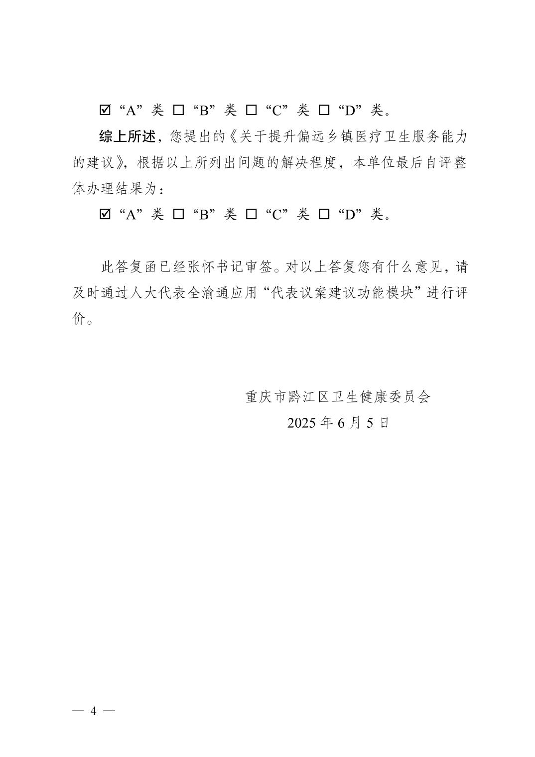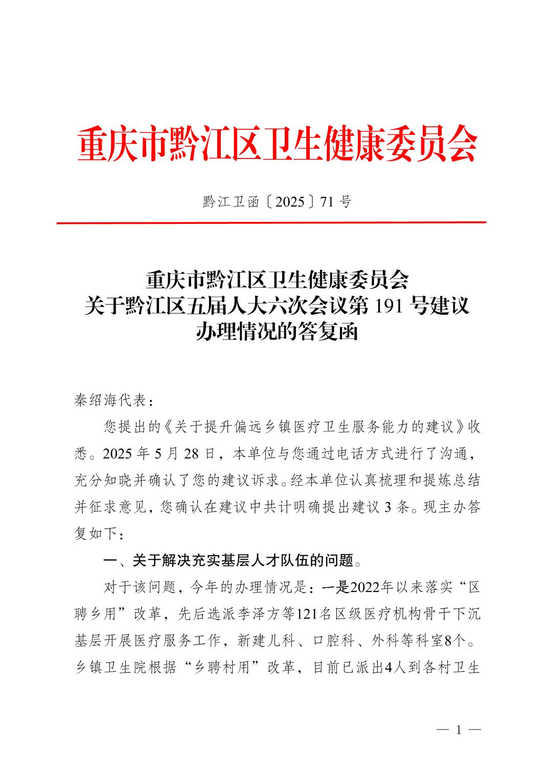 重慶市黔江區(qū)衛(wèi)生健康委員會關于黔江區(qū)五屆人大六次會議第191號建議辦理情況的答復函