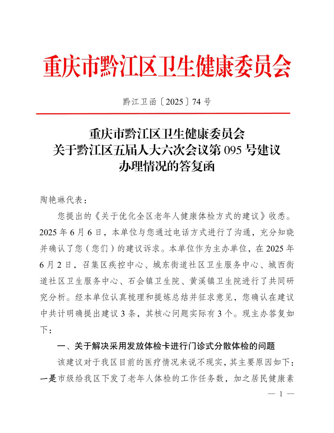重慶市黔江區(qū)衛(wèi)生健康委員會關(guān)于黔江區(qū)五屆人大六次會議第095號建議辦理情況的答復(fù)函