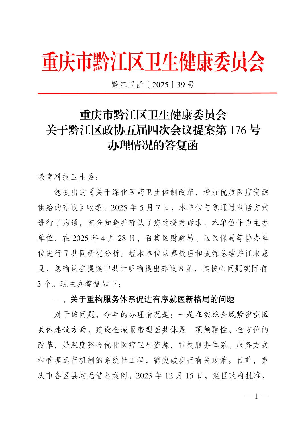 重慶市黔江區衛生健康委員會關于黔江區政協五屆四次會議提案第176號辦理情況的答復函
