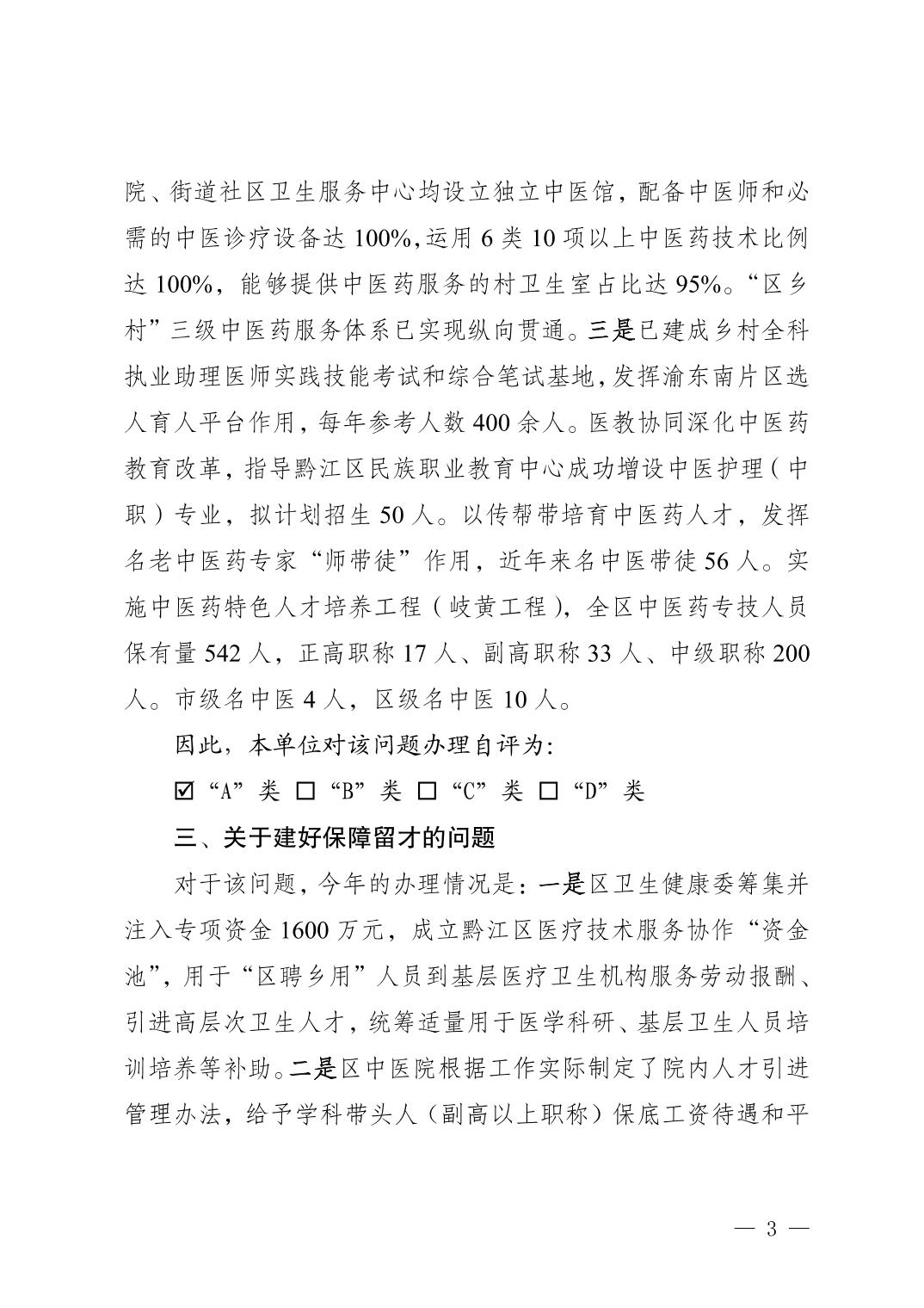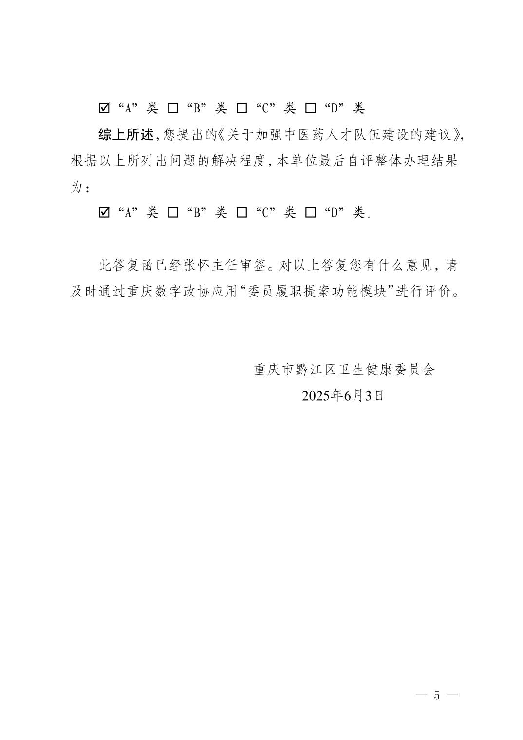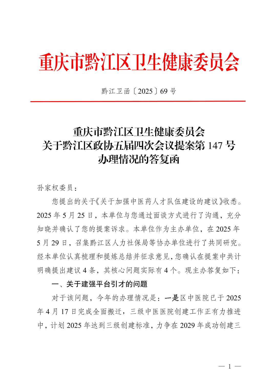 重慶市黔江區衛生健康委員會關于黔江區政協五屆四次會議提案第147號辦理情況的答復函