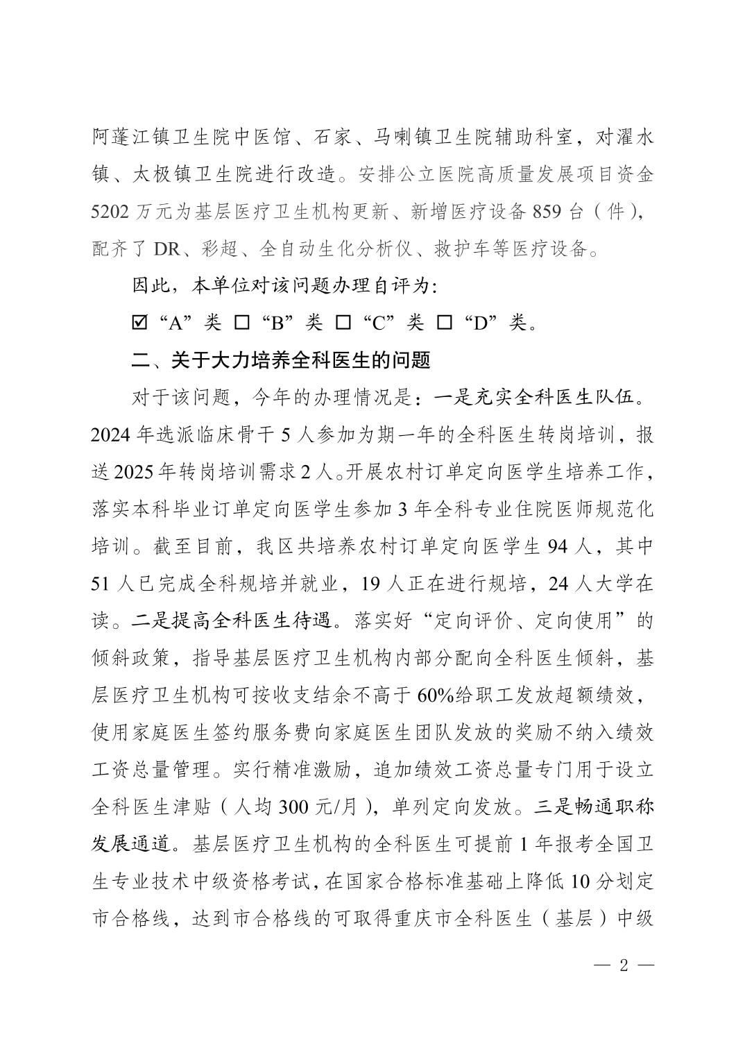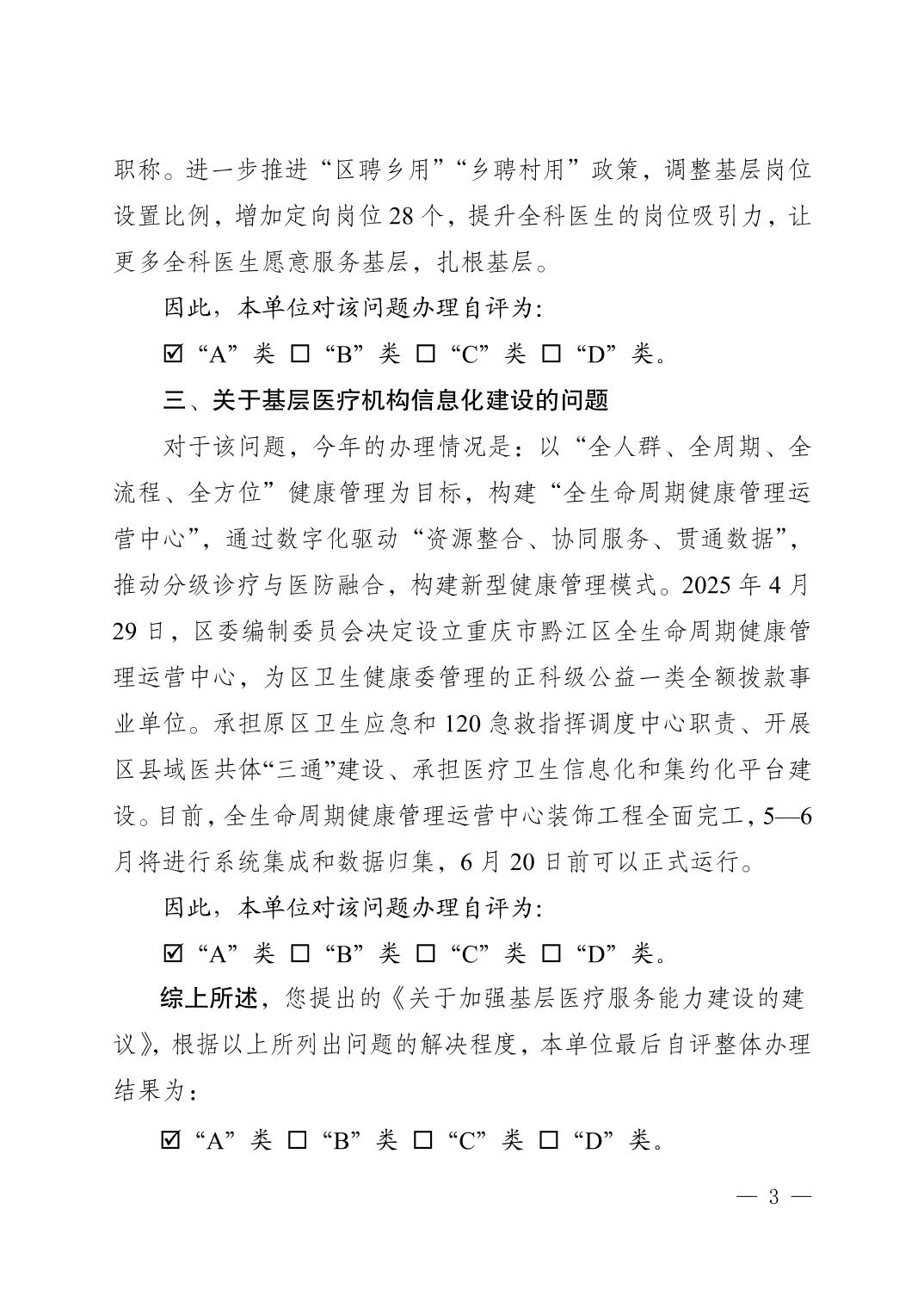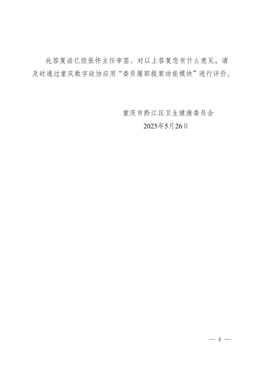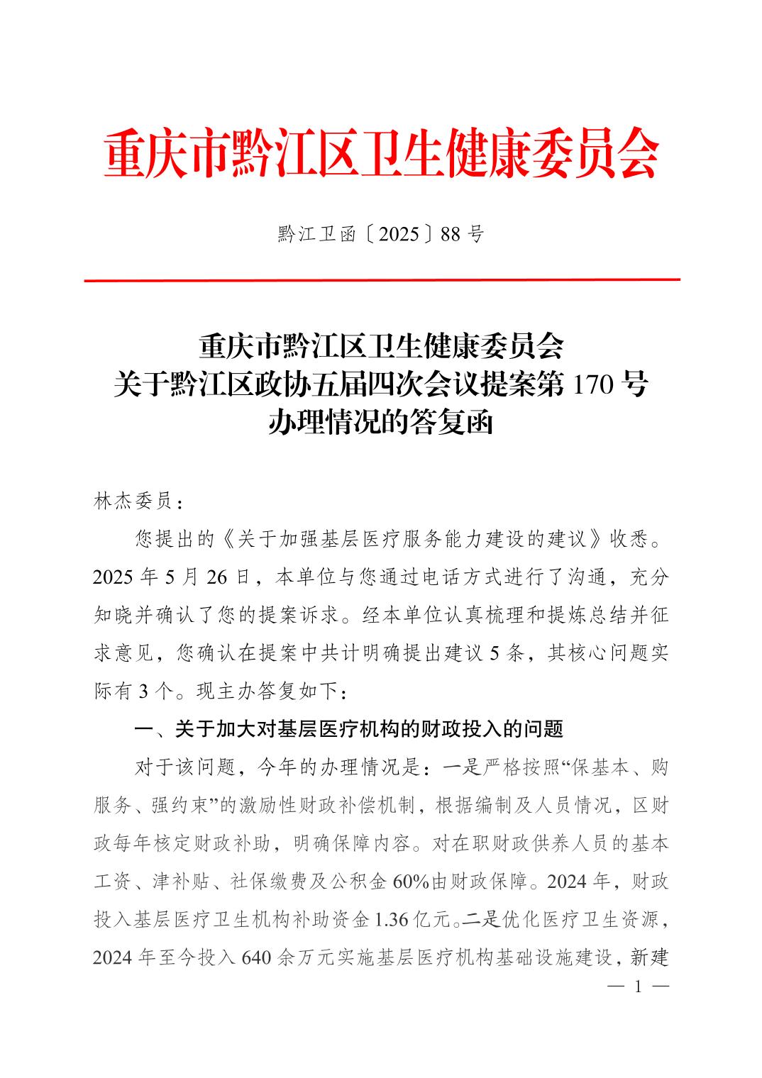 重慶市黔江區衛生健康委員會關于黔江區政協五屆四次會議提案第170號辦理情況的答復函