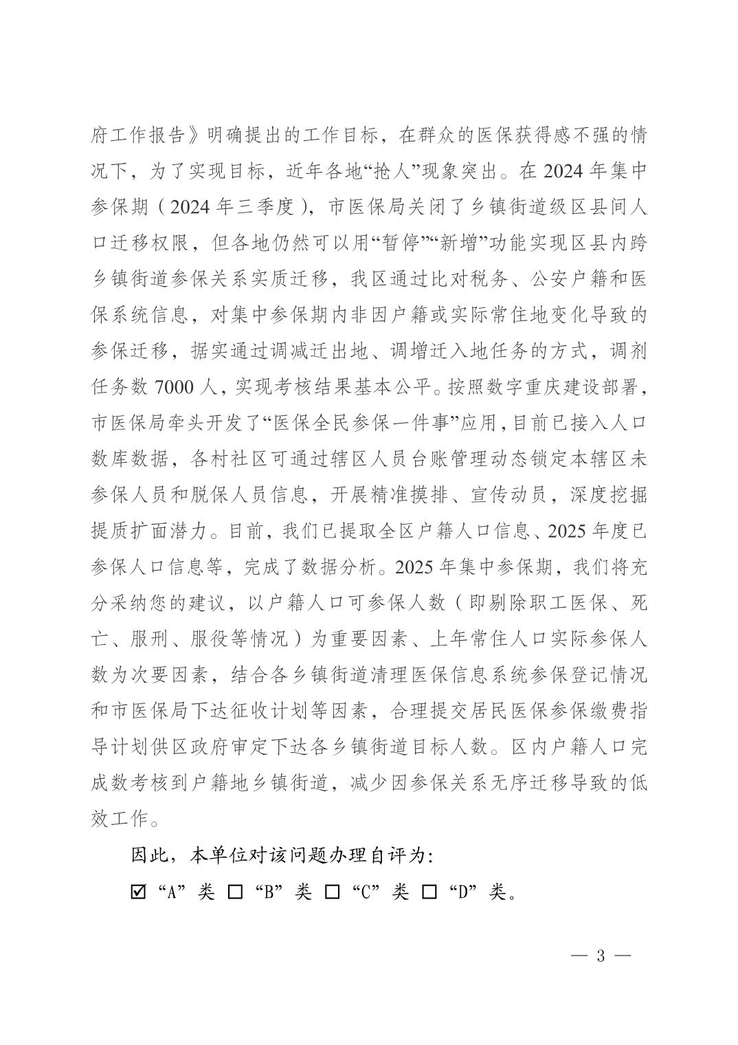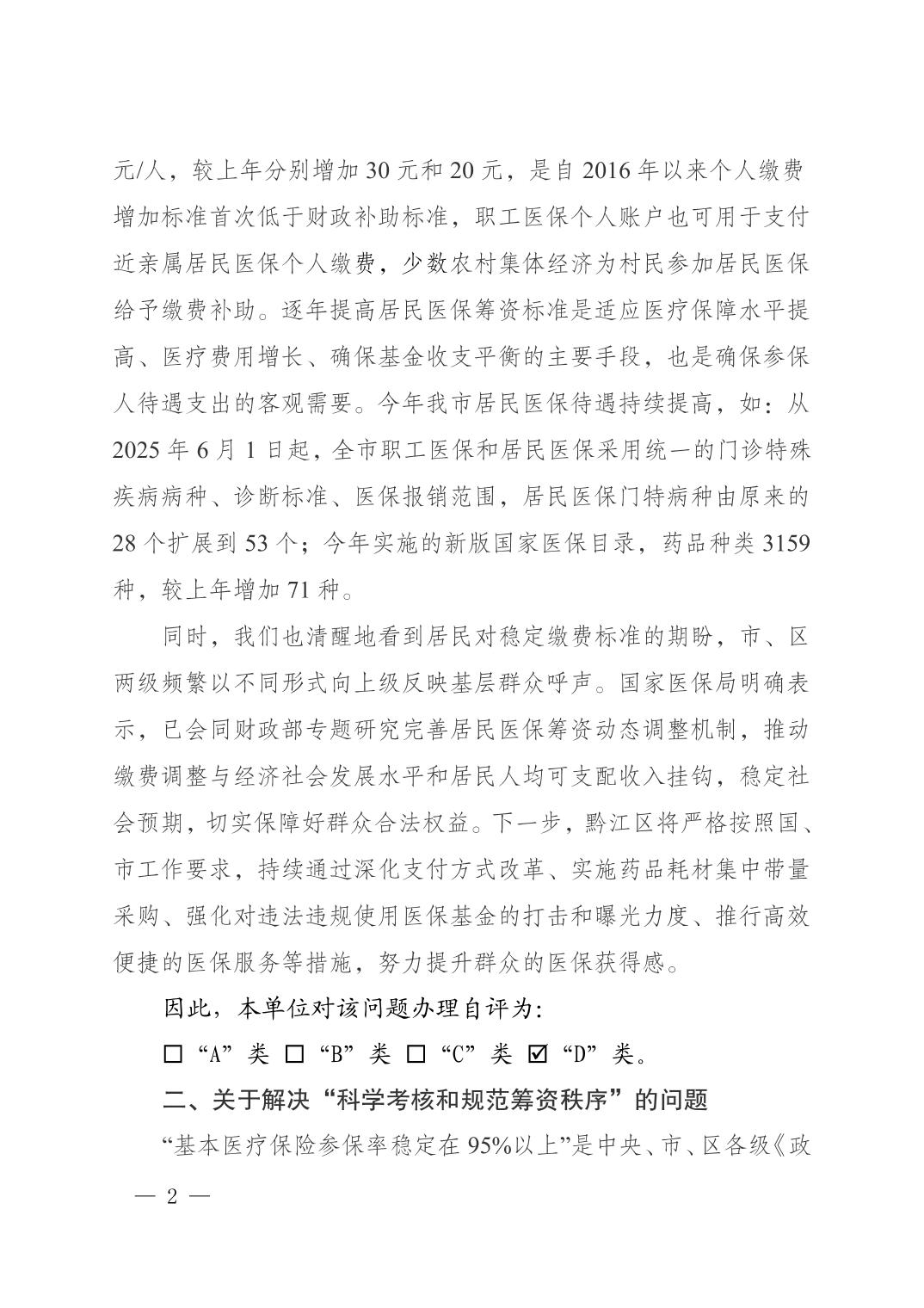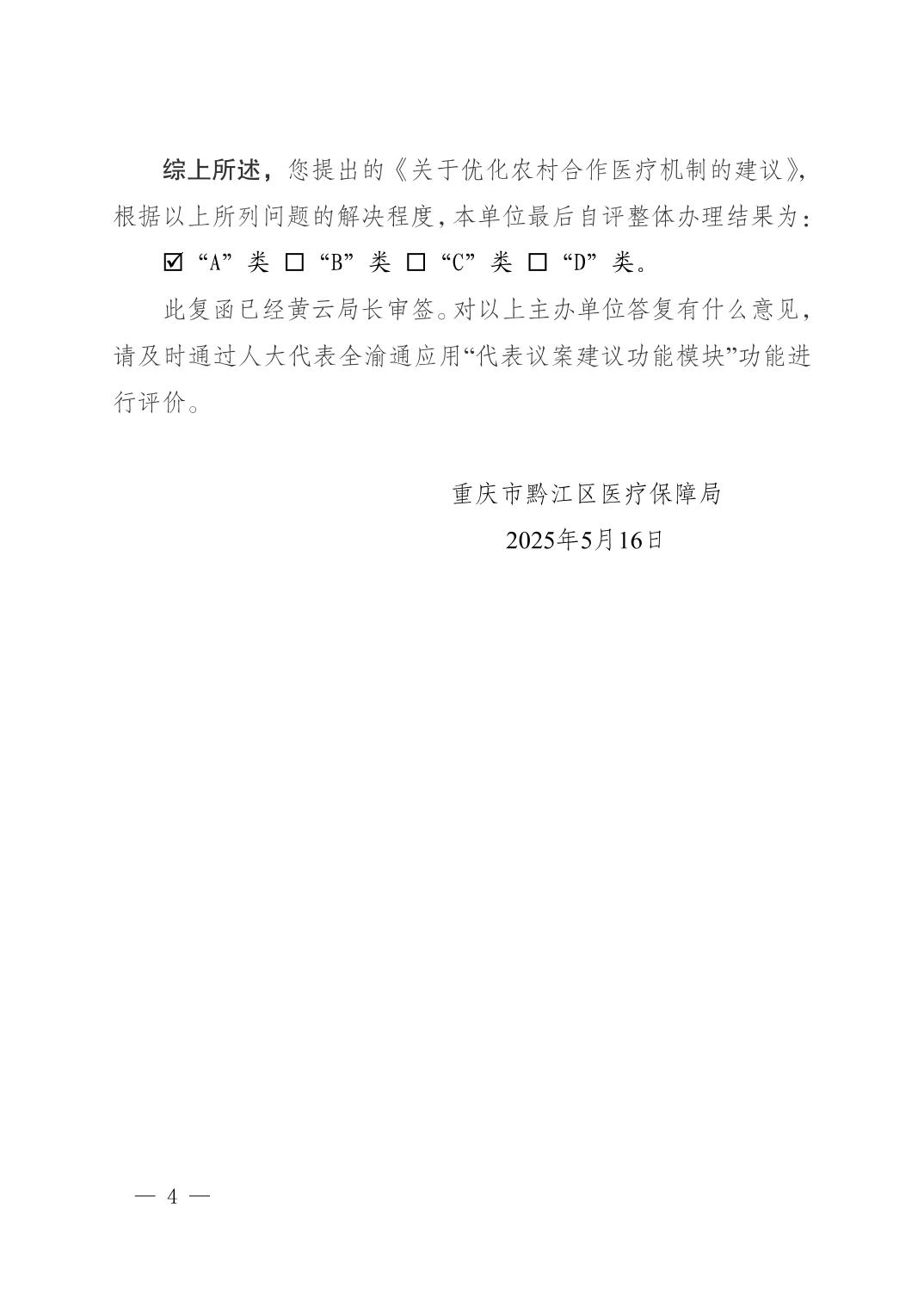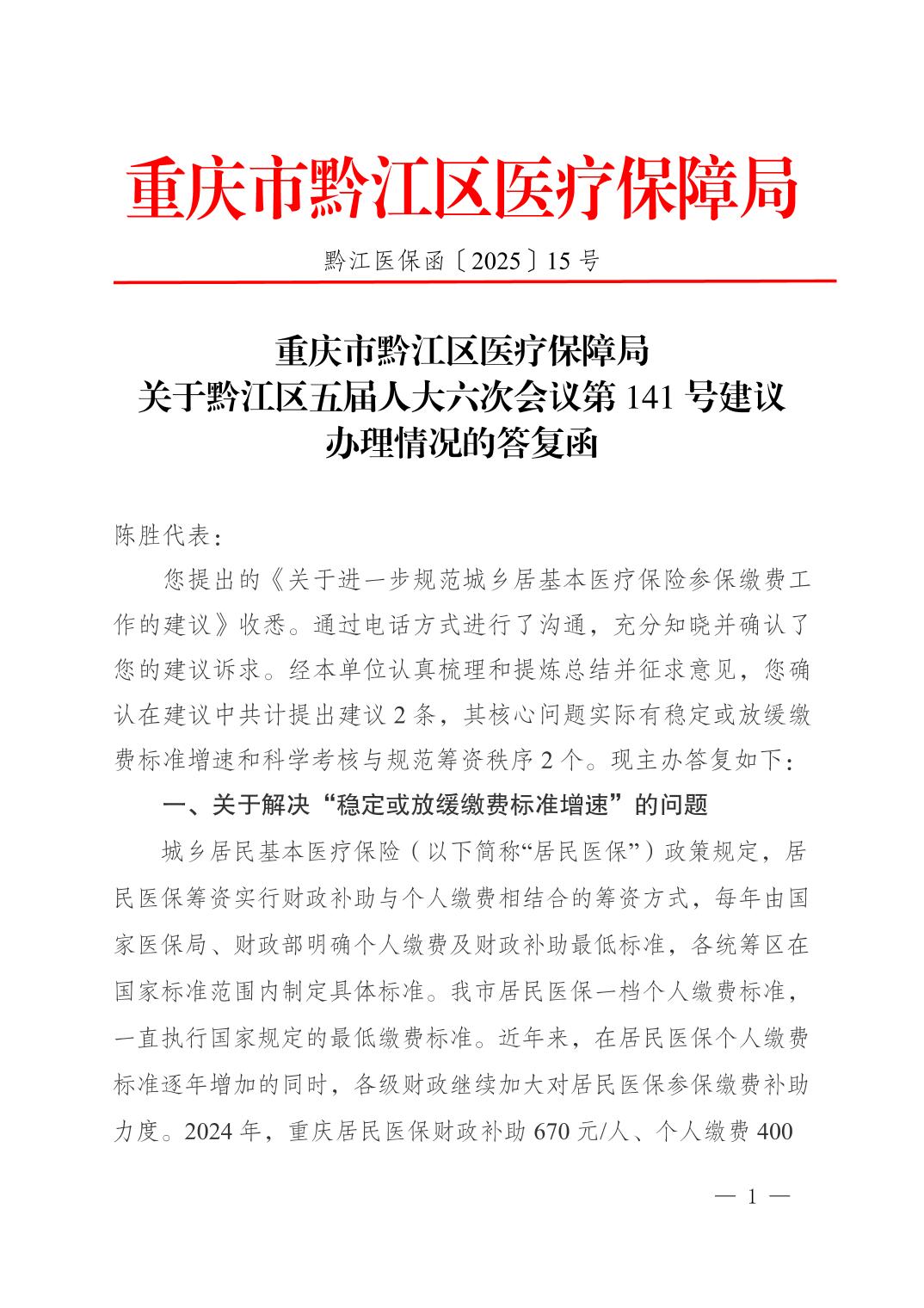 重慶市黔江區醫療保障局關于黔江區五屆人大六次會議第141號建議辦理情況的答復函