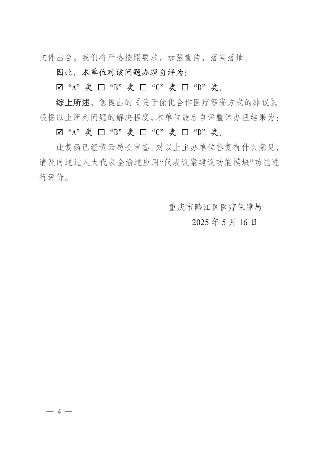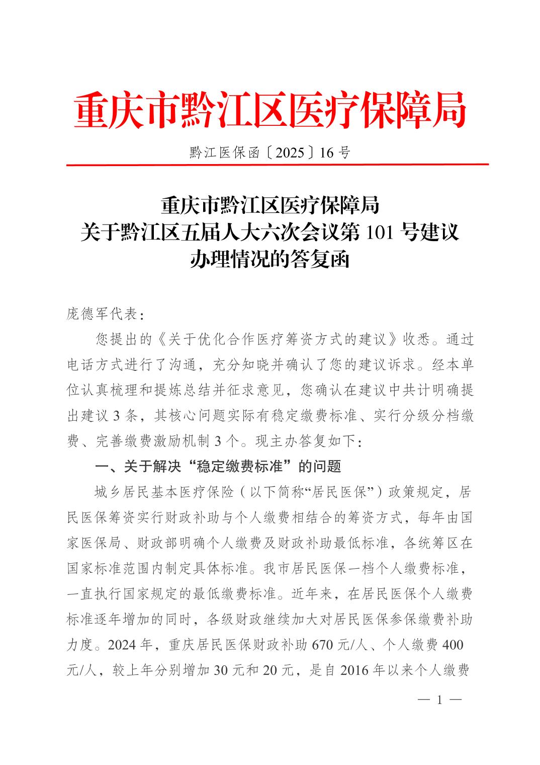 重慶市黔江區醫療保障局關于黔江區五屆人大六次會議第101號建議辦理情況的答復函