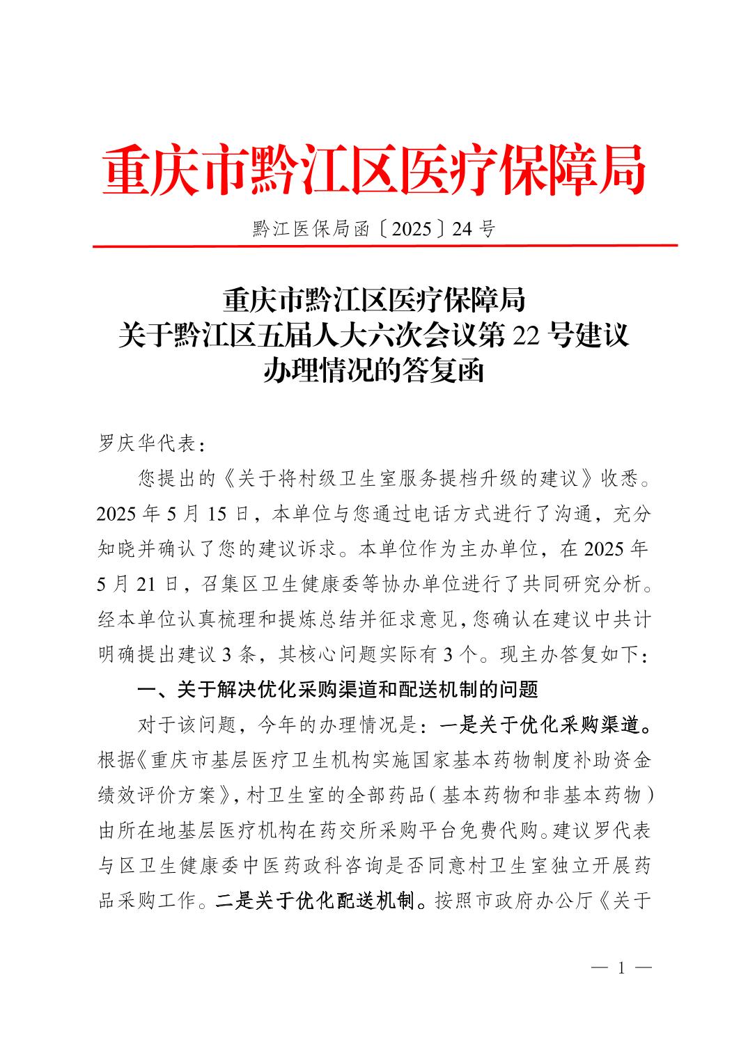 重慶市黔江區(qū)醫(yī)療保障局關(guān)于黔江區(qū)五屆人大六次會議第22號建議辦理情況的答復(fù)函
