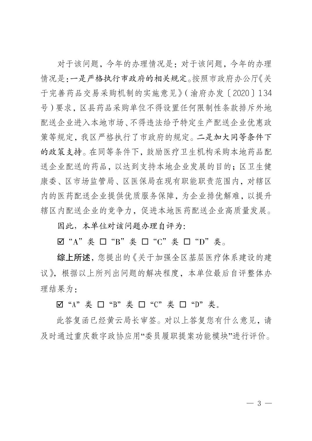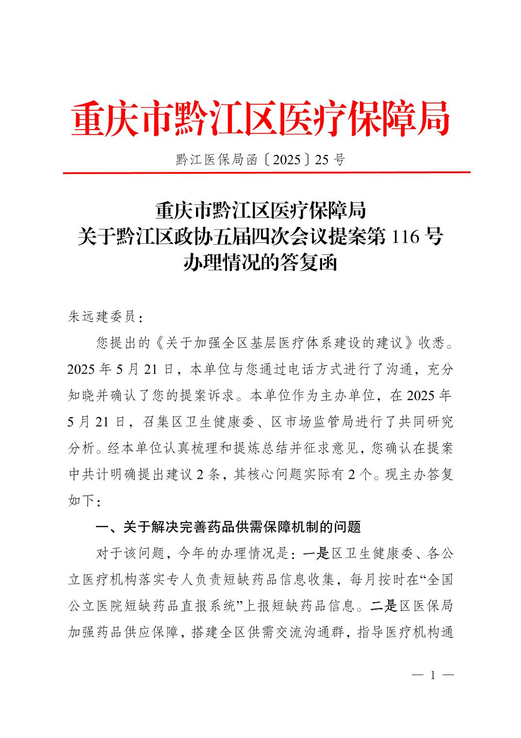 重慶市黔江區(qū)醫(yī)療保障局關于黔江區(qū)政協(xié)五屆四次會議提案第116號辦理情況的答復函