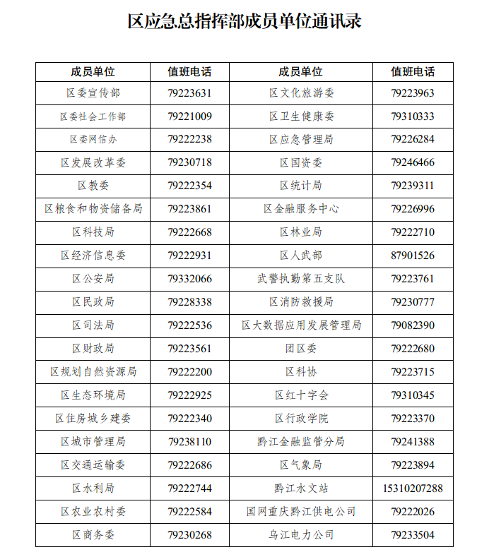 區委宣傳部、區委社會工作部、區委網信辦、區發展改革委(區糧食和物資儲備局)、區教委、區科技局、區經濟信息委、區公安局、區民政局、區司法局、區財政局、區規劃自然資源局、區生態環境局、區住房城鄉建委、區城市管理局、區交通運輸委、區水利局、區農業農村委、區商務委、區文化旅游委、區衛生健康委、區應急管理局、區國資委、區統計局、區金融服務中心、區林業局、區人武部、武警執勤第五支隊、區消防救援局、區大數據應用發展管理局、團區委、區科協、區紅十字會、區行政學院、黔江金融監管分局、區氣象局、黔江水文站、國網重慶黔江供電公司、烏江電力公司為成員單位。